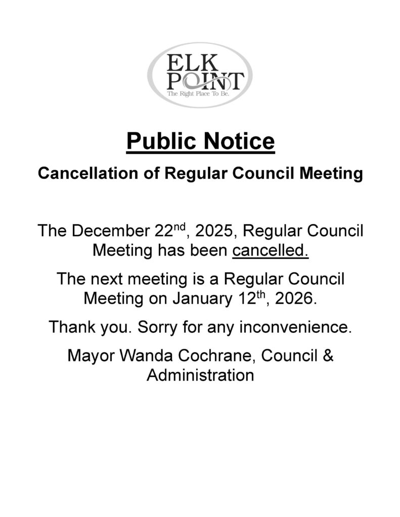 Cancellation of December 22nd, 2025 Regular Council Meeting