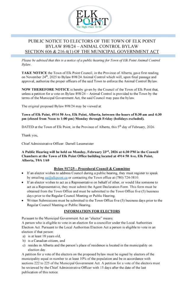 Public Hearing Notice – Bylaw 898/24 Animal Control Bylaw